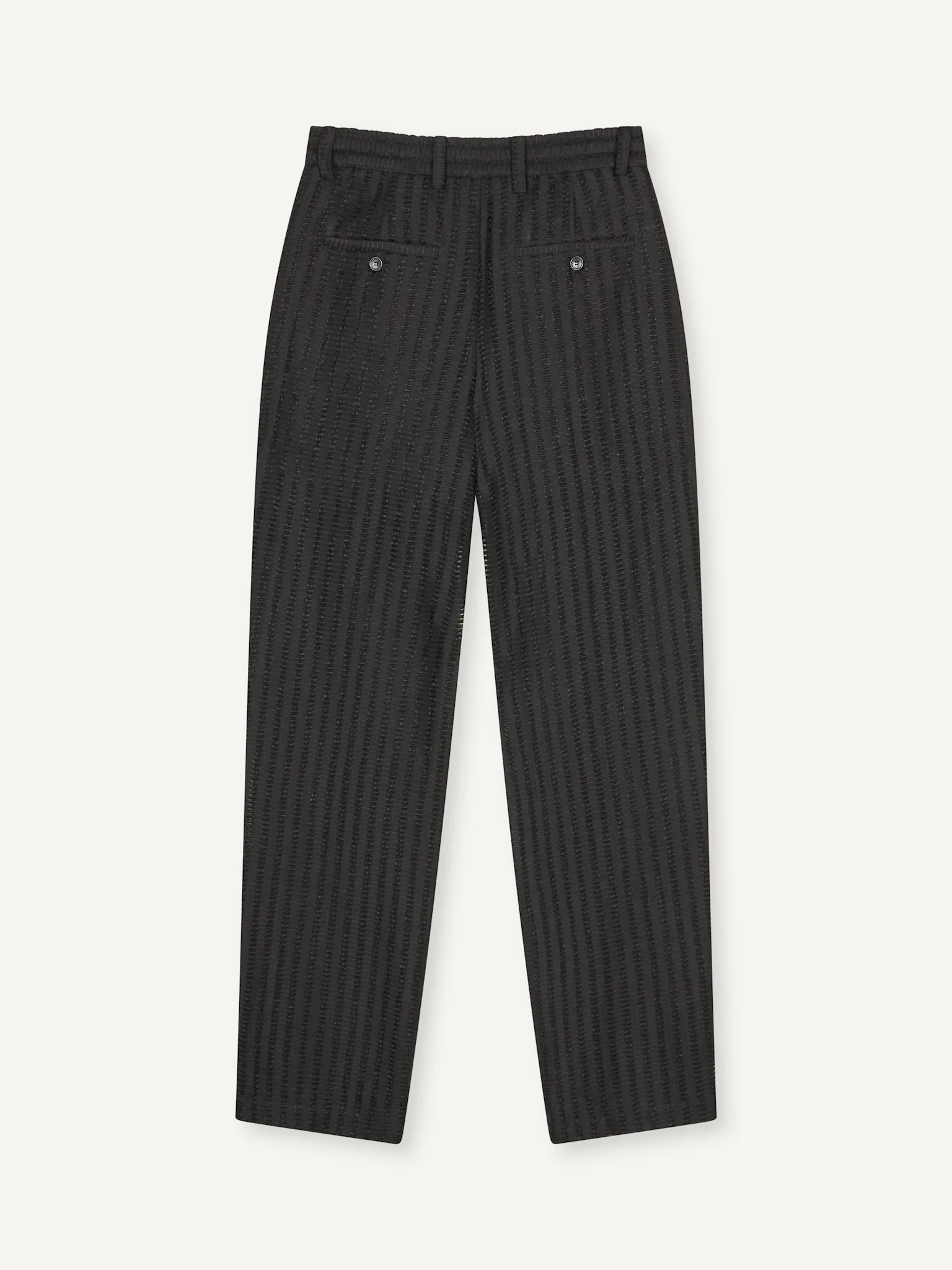 A relaxed everyday essential. The Agency trouser is cut from a structure weave, a staple in our tailoring program and an elevation of our classic Smoke trousers. This full length, wide legged style trouser is perfect to complete a full contemporary suit in interesting silhouettes or simply a shirt or tee. Elasticated waist, center front zip fly and button closure. Welt pockets at the back and slanted pockets at the front.Ā