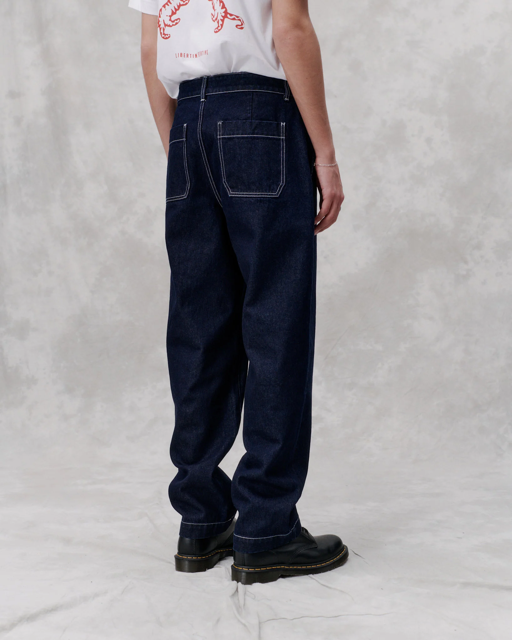 The Alert pants is cut from a denim weave. They have a relaxed fit, front zip fly, button closure and patch pockets at back.Ā