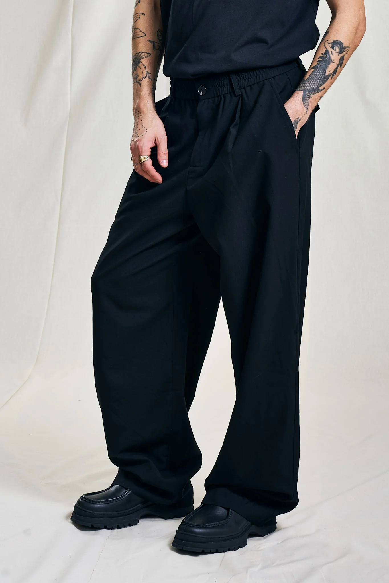Voluminous, wide and full length fit, with elastic waistband. back pocket flaps and transparent buttons for a clean expression.Ā
