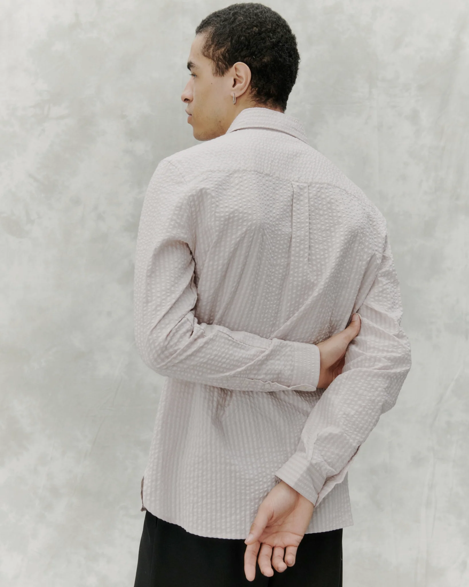 Cut from a crisp and light seersucker weave with a striped texture in organic cotton. Regular fit, straight point collar and rounded hemline. Ā
