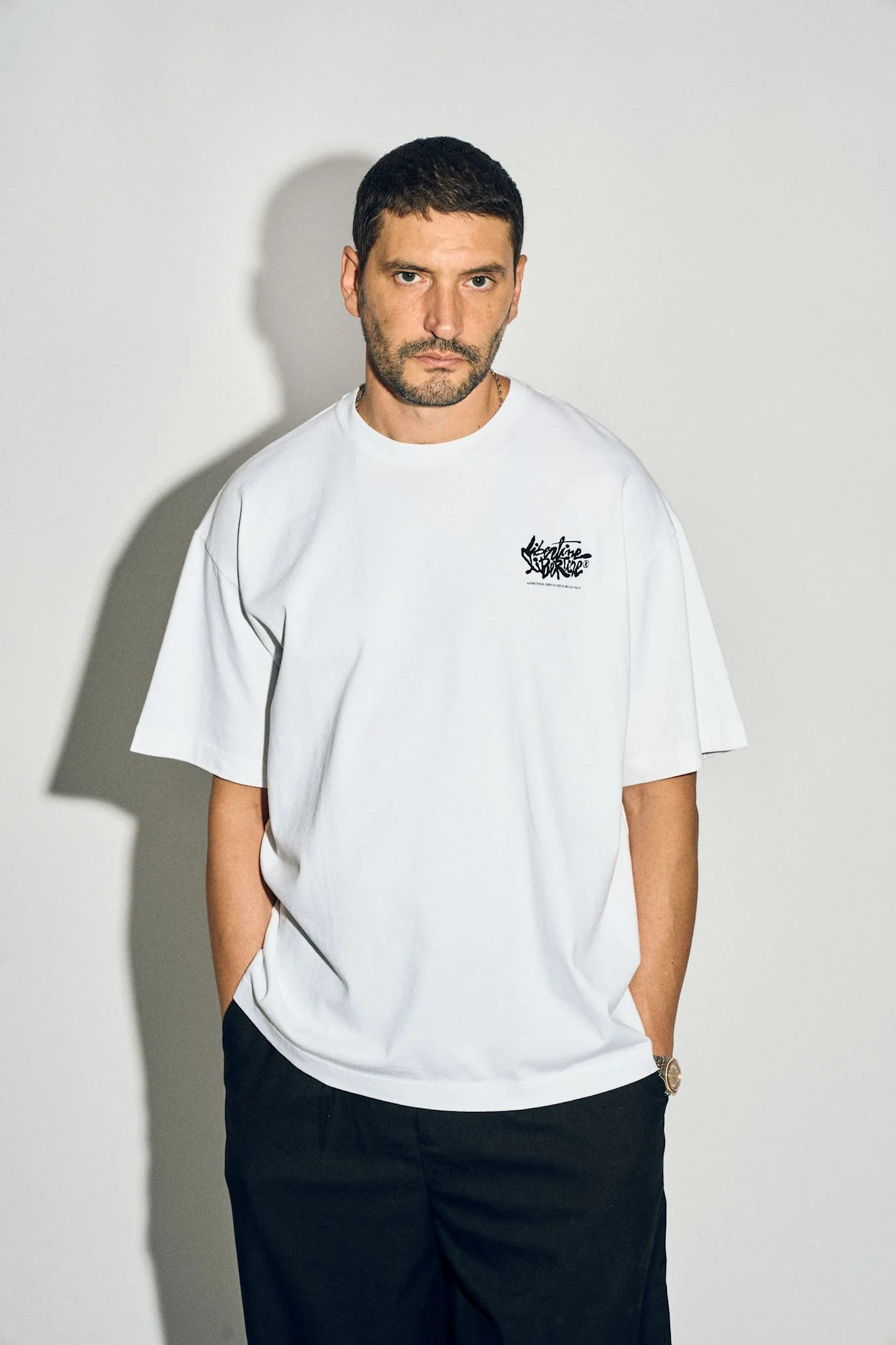 A dense and heavy, slightly washed cotton t-shirt with ERA Logo print on front and back.