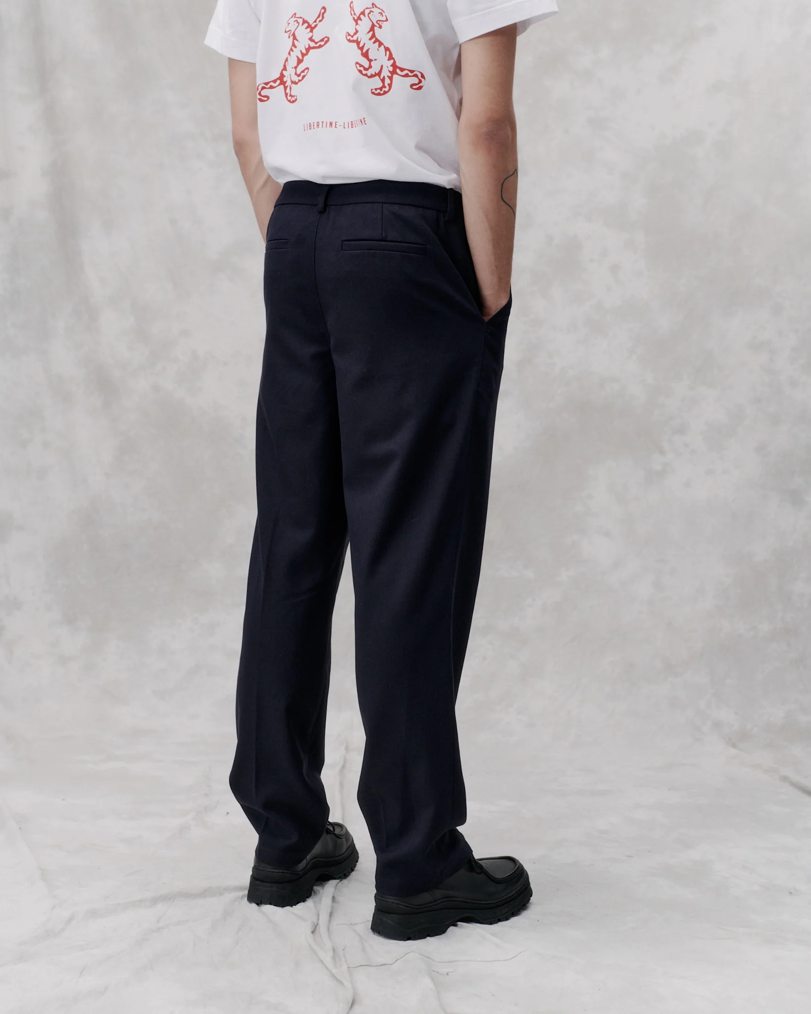 Heavy twill weaved trousers in a moderate straight leg fit a staple in our tailoring program with new detail at closure. The pant has hidden zip fly closure, buttons and paspel back pockets.