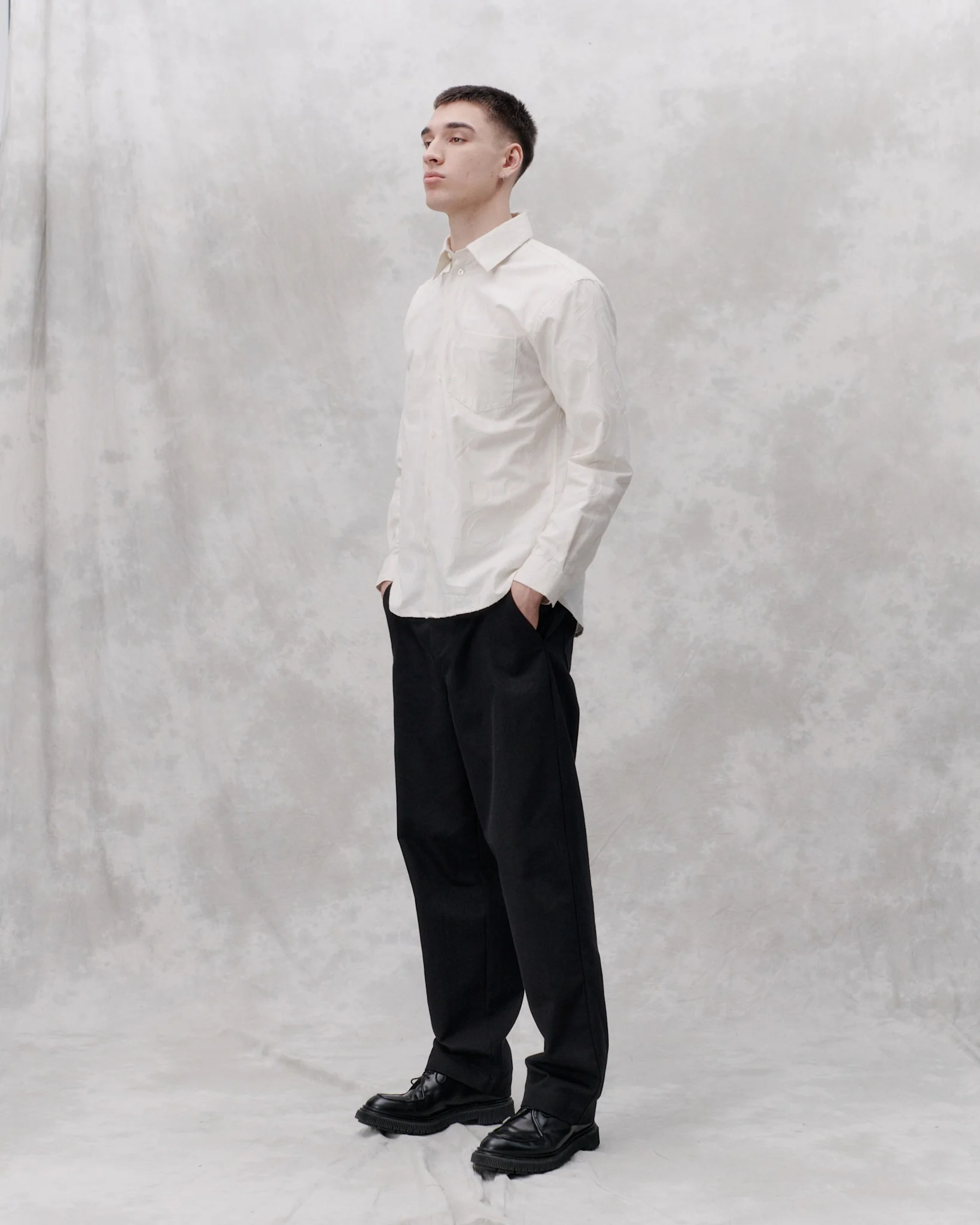 A clean generously fitted shirt with stich less placket and collar cut from a jacquard cotton. Pearl look buttons on placket and cuffs. This style is ideal for completing a laid back suit look.