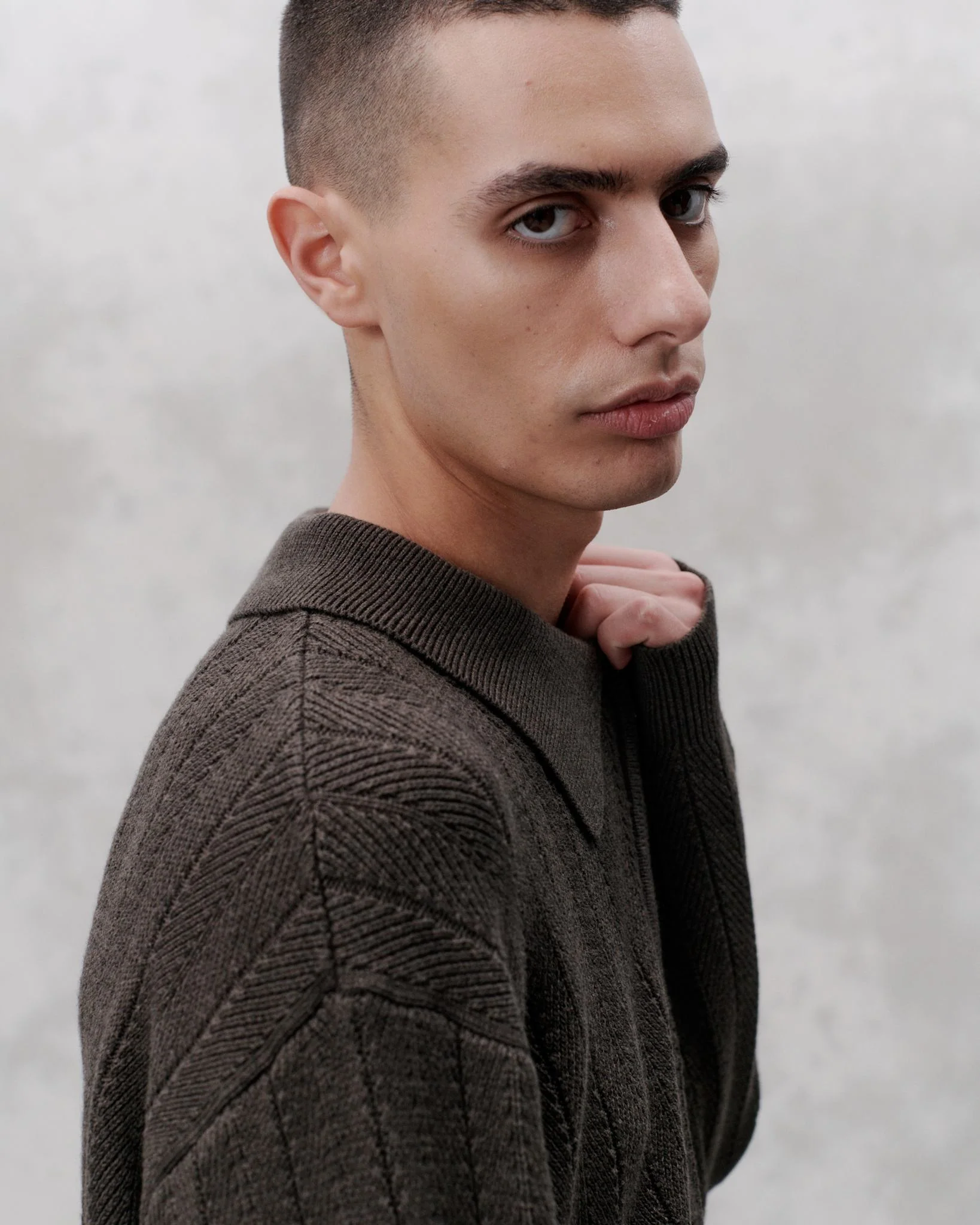 Scent is our 7GG half zip knit with a collar. Made in a structured herringbone stitch The Scent knit features ribbed sleeve and bottom hem for nice fit.Ā