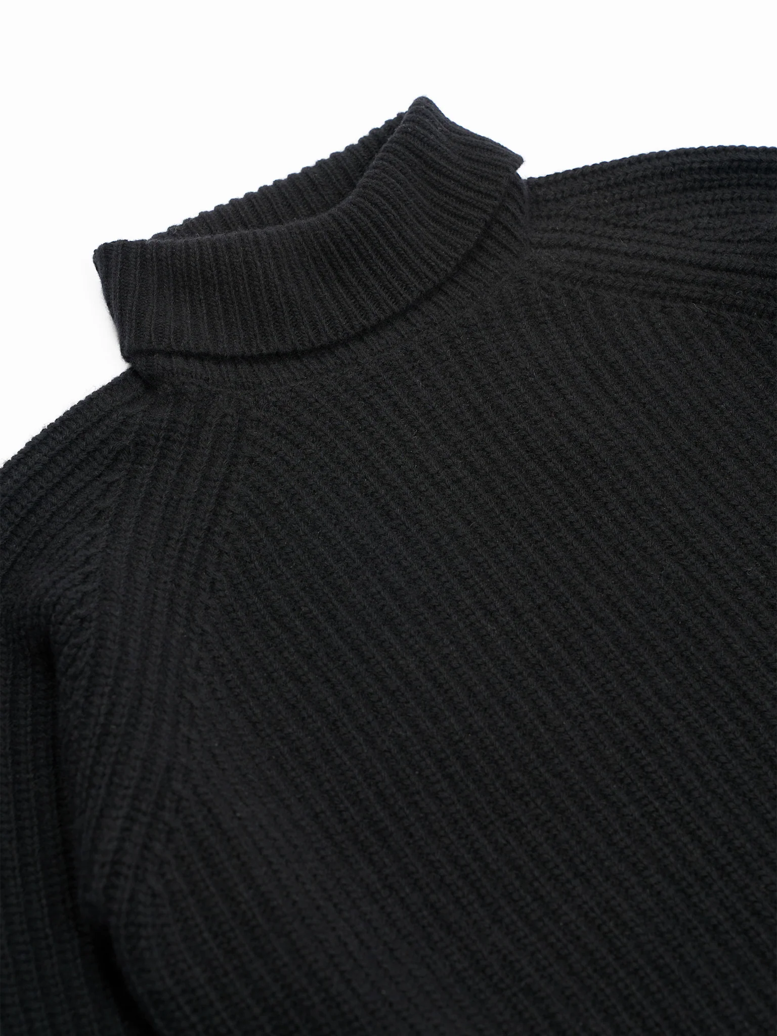 Session is a 5 Gauge half stitch knitted roll neck jumper made from soft extrafine wool. It comes in a relaxed fit with raglan sleeves and two and two ribbed cuffs and bottom hem and a one and one ribbed neck.